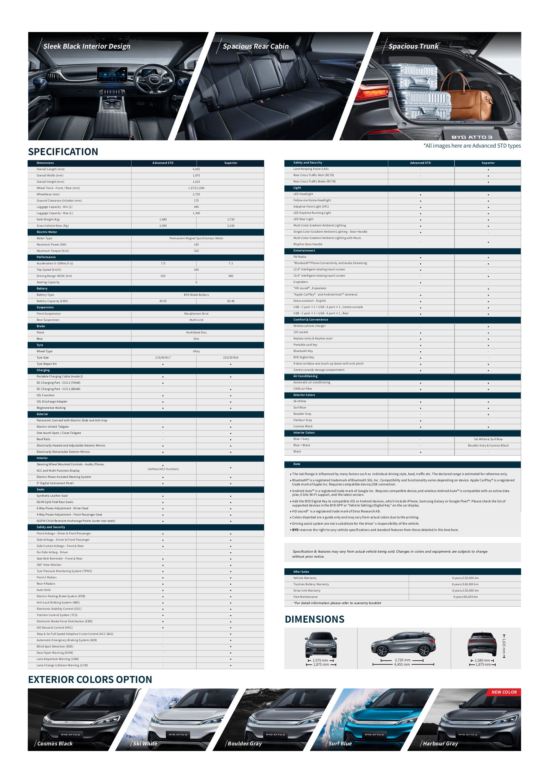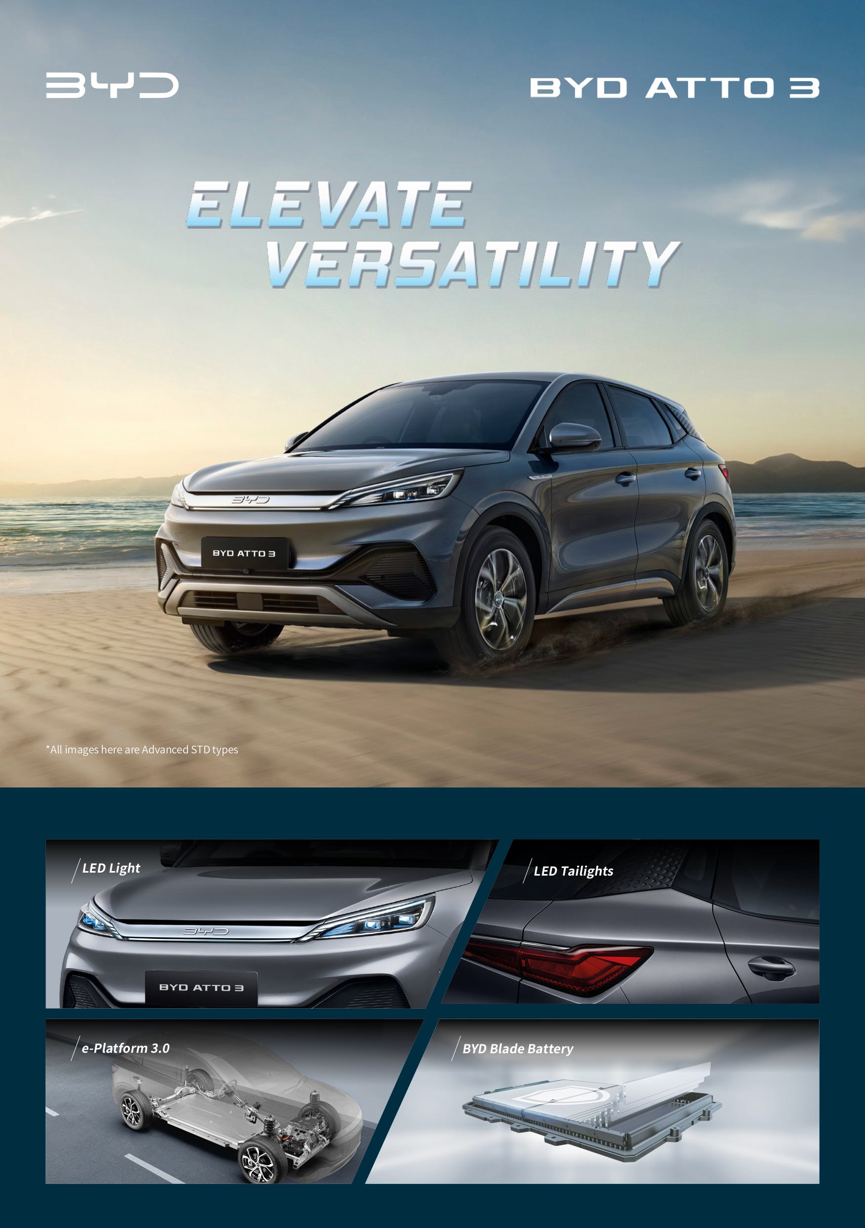 BYD ATTO 3 adalah E-SUV Sporty Lahir Pertama, yang menandai dimulainya era listrik baru. BYD ATTO 3 memadukan enam keunggulan inti: Penampilan Terdepan dalam Tren, Interior Berirama, Tenaga Menakjubkan, Pengaturan Menyenangkan, Platform EV Terlahir, dan Baterai Blade Sangat Aman.