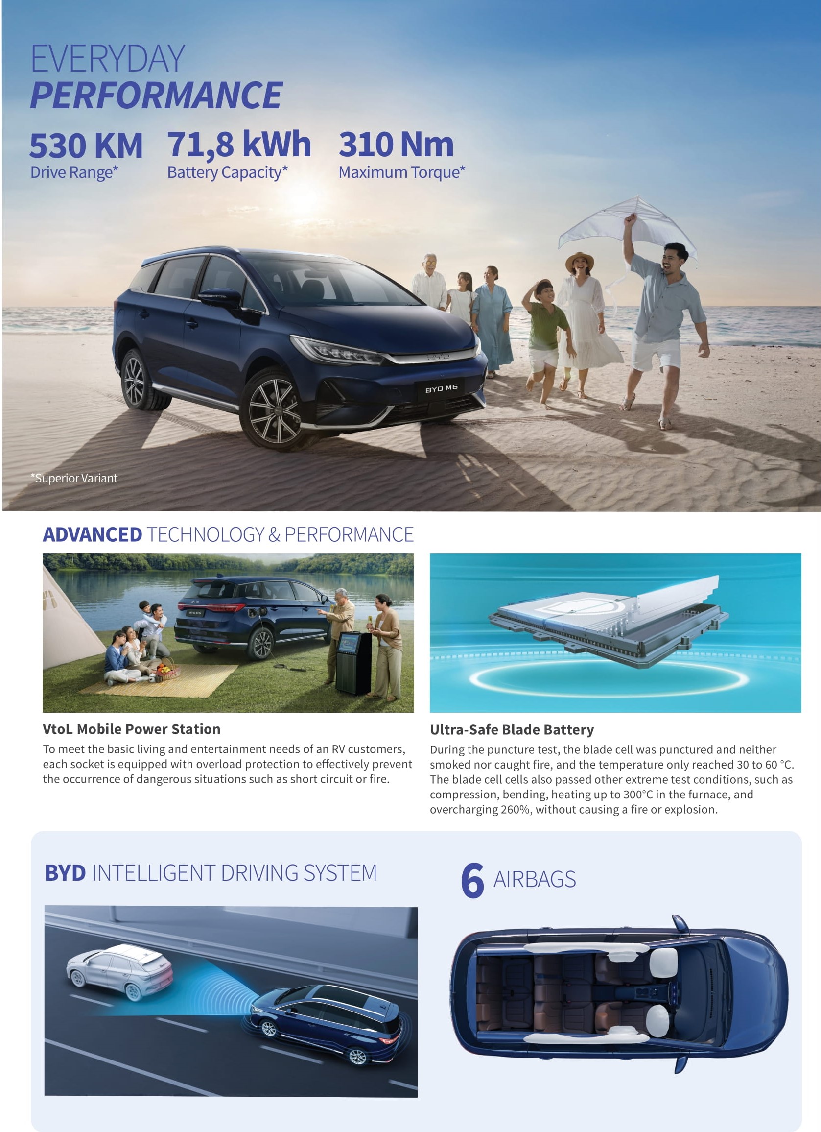 BYD M6 hadir dengan teknologi baterai andalan BYD, yakni Blade Battery berkekuatan 71,8 kWh yang mampu menempuh jarak hingga 500 km sekali pengisian daya (metode NEDC). Baterai LFP Blade Battery Cell to Pack (CTP) generasi terbaru ini menetapkan standar baru dalam hal keandalan, keamanan, kinerja, dan kepadatan energi baterai di kendaraan listrik.