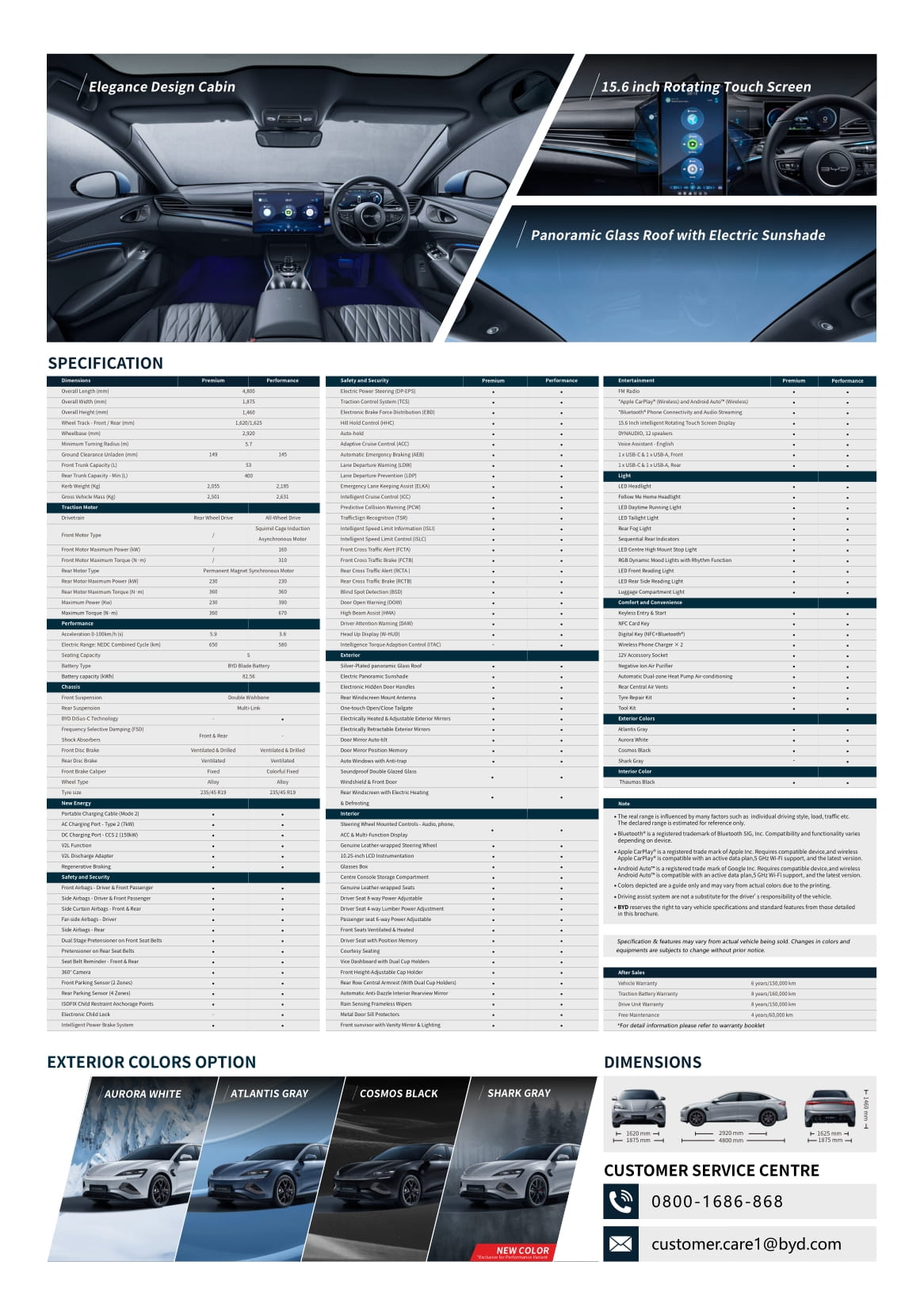 | Performance Battery BYD Blade Battery Acceleration 0-100km/h 3.8s Driving Range 580KM NEDC, 570KM WLTP Drivetrain All-wheel drive Seating Capacity 5 seats Kerb Weight 2,185 KG Max luggage capacity 450L Maximum Power 390KW Wheels 19″Alloy 235/45 R19 Display 15.6″ Rotating touch screen | |